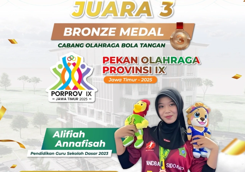 Alifiah Annafisah, mahasiswi Prodi Pendidikan Guru Sekolah Dasar (PGSD) Universitas Nahdlatul Ulama Sidoarjo (UNUSIDA) angkatan 2023, sukses mengukir prestasi membanggakan. Alifiah berhasil meraih Juara 3 (Bronze Medal) cabang olahraga Bola Tangan dalam ajang Pekan Olahraga Provinsi (Porprov) IX Jawa Timur 2025 yang diselenggarakan di Kabupaten Malang.