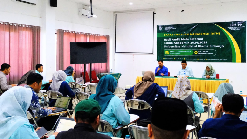 SIDOARJO – Universitas Nahdlatul Ulama Sidoarjo (UNUSIDA) menggelar Rapat Tinjauan Manajemen (RTM) dalam rangka menindaklanjuti Hasil Audit Mutu Internal (AMI) Tahun 2024/2025. Kegiatan ini berlangsung pada Senin (22/9/2025) di Hall Lantai 4, Kampus 2 UNUSIDA, dan dihadiri oleh jajaran pimpinan universitas, para Dekan, Ketua Program Studi (Kaprodi), serta Kepala Biro (Kabiro) di lingkungan UNUSIDA.