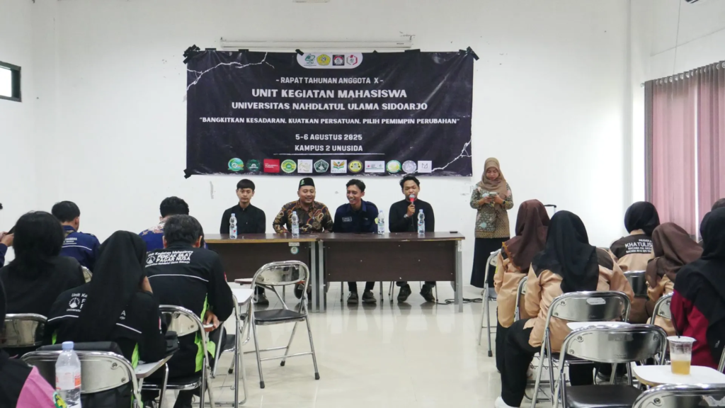 Sidoarjo – Seluruh Unit Kegiatan Mahasiswa (UKM) Universitas Nahdlatul Ulama Sidoarjo (UNUSIDA) serentak menggelar Rapat Tahunan Anggota (RATA) ke-10 pada Rabu-Kamis, (5–6/8/2025). Kali ini, RATA yang dikomandoi oleh KPU-M bersama Bawaslu-M ini mengusung tema ‘Bangkitkan Kesadaran, Kuatkan Persatuan, Pilih Pemimpin Perubahan’ yang dihadiri oleh seluruh perwakilan UKM dan pengurus periode 2024–2025.