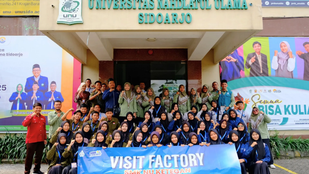 SIDOARJO — Universitas Nahdlatul Ulama Sidoarjo (UNUSIDA) menerima kunjungan dari siswa-siswi SMK NU Ketegan pada Rabu (3/11/2025). Kegiatan campus visit ini diikuti oleh peserta didik kelas XI dan XII dari Jurusan Akuntansi serta Desain Komunikasi Visual (DKV). Kunjungan tersebut dipusatkan di Kampus 2 UNUSIDA dan bertujuan memberikan wawasan perguruan tinggi serta mengenalkan lingkungan akademik kepada para siswa.